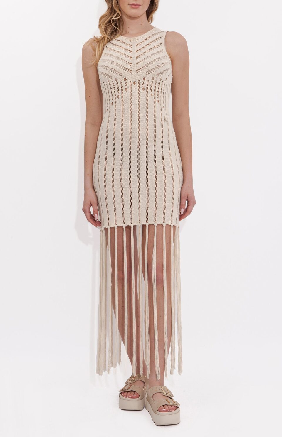Czarna sukienka midi wykonana z ażurowej, szydełkowej dzianiny. Dopasowany fason z długim rękawem i głębokim dekoltem podkreśla sylwetkę, a prześwitująca struktura dodaje zmysłowego charakteru. Falowany dół wykończenia nadaje całości subtelnej lekkości.