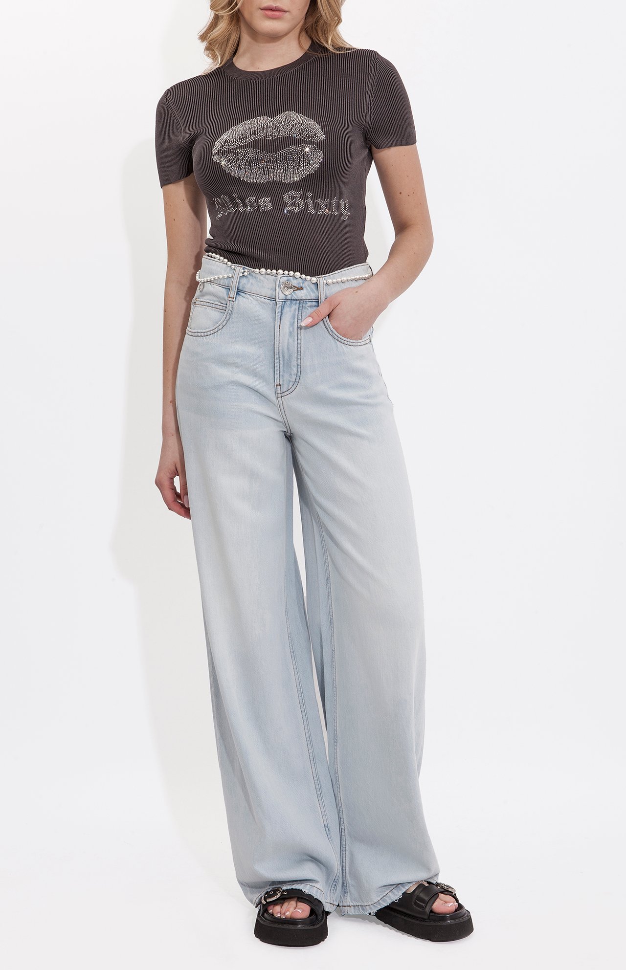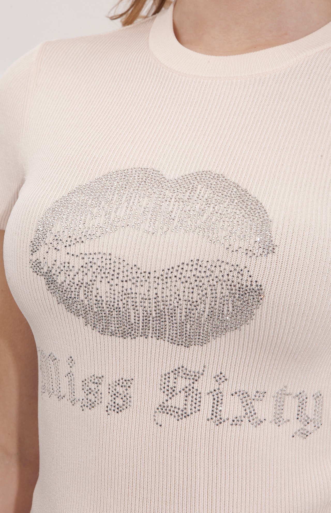 - Detale: aplikacja z kryształków – usta i napis „Miss Sixty”