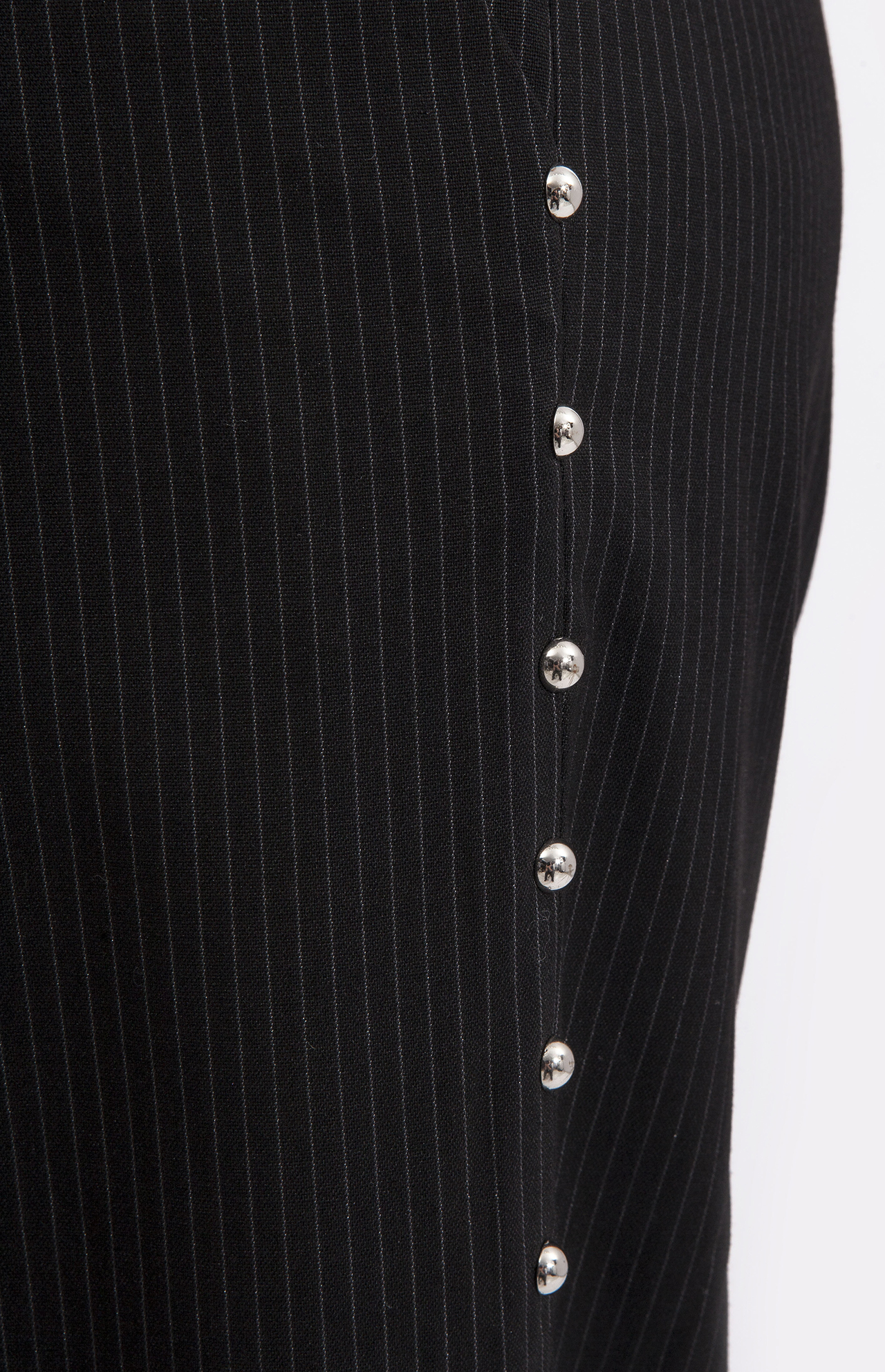Spodnie Lola Casademunt w elegancki prążek to połączenie klasyki i nowoczesnego detalu. Szeroka nogawka i delikatne rozcięcia po bokach optycznie wydłużają sylwetkę, a srebrne napy nadają całości oryginalnego charakteru. Model wyróżnia się subtelnym połyskiem tkaniny i złotym emblematem z logo marki. Doskonale komponują się z marynarką z tej samej linii.