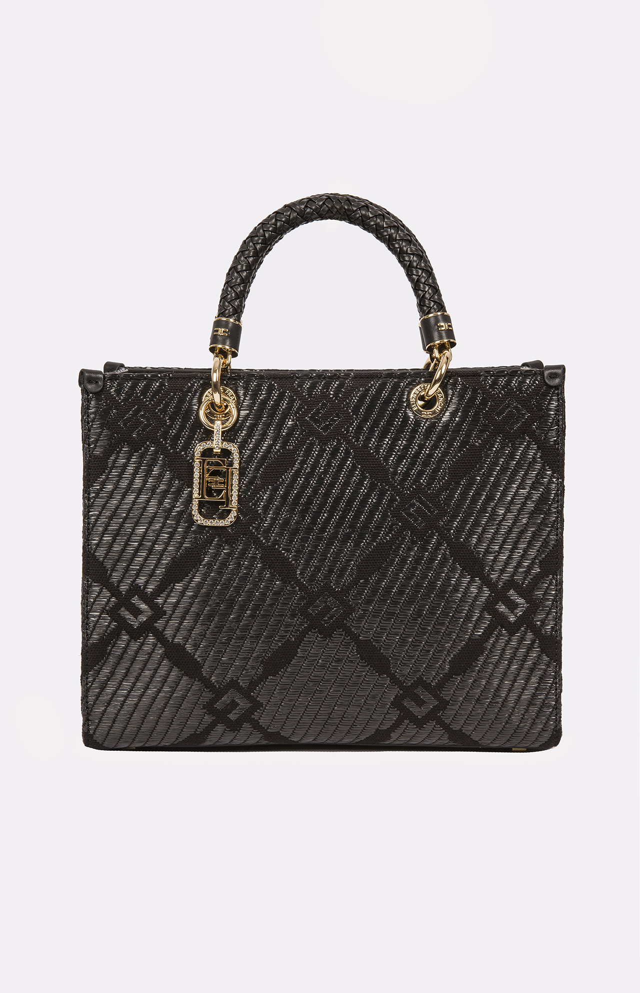• Detale: plecione rączki, regulowany pasek, złota zawieszka z logo wysadzaną kryształkami, subtelny geometryczny wzór